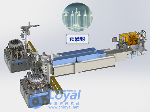 西林瓶生產線包括:自動上管、自動成型、經機械手轉換至前端檢測線(也叫生產管控)、檢測線檢測的項目:1、瓶口內外徑 2、瓶身長短 3、瓶身外徑 4、瓶口邊厚 5、瓶底內凹尺寸檢測;經檢測后的合格品再用機械手夾盤轉換至退火爐網帶上,經高溫減除應力后再降溫,通過氣動吸盤將回火后的小瓶轉換至后端檢測線,后端檢測(也是重檢也叫終檢),經后端拍照檢測項目